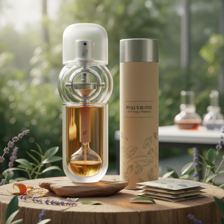 Image: An innovative, sustainable perfume bottle design with a visible refill mechanism, highlighting eco-friendly materials and functionality.